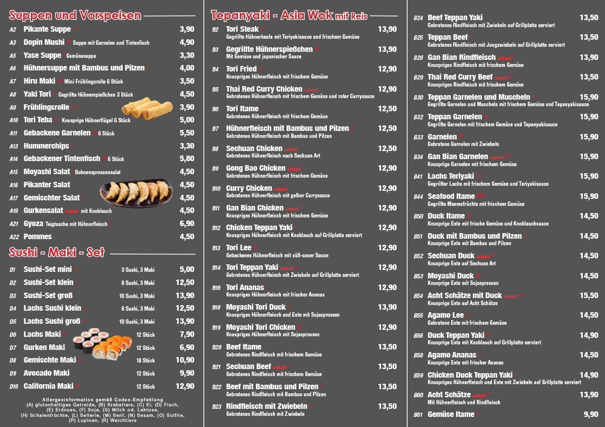 Sie werden über das riesige Tepan Yaki-Asia Wok Angebot überrascht sein - da ist für jeden Geschmack etwas dabei! Ob leckere Variationen aus Hühner-, Rind- oder Entenfleisch, Muschel oder Meeresfrüchte-Spezialitäten - alle Gerichte werden aus frischen Zutaten mit viel Liebe vor Ihren Augen zubereitet! Natürlich werden auch Reis- und Nudelfans mit asiatischen Hochgenüssen verwöhnt und Sushi-Freunde finden ein umfangreiches Sushi-Maki-Angebot am Buffet. Zu guter Letzt - was wäre ein asiatisches Essen ohne gebackene Banane oder Mangopudding am Schluss?
